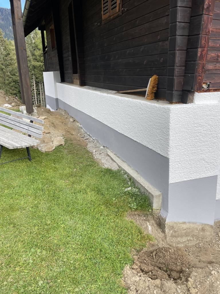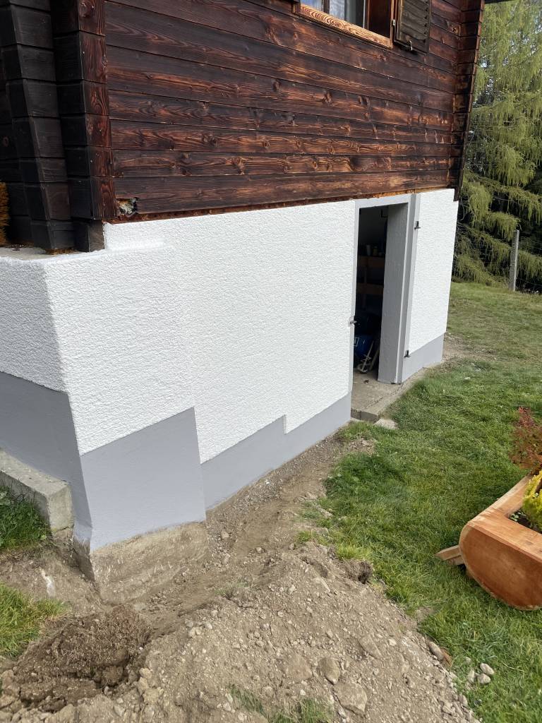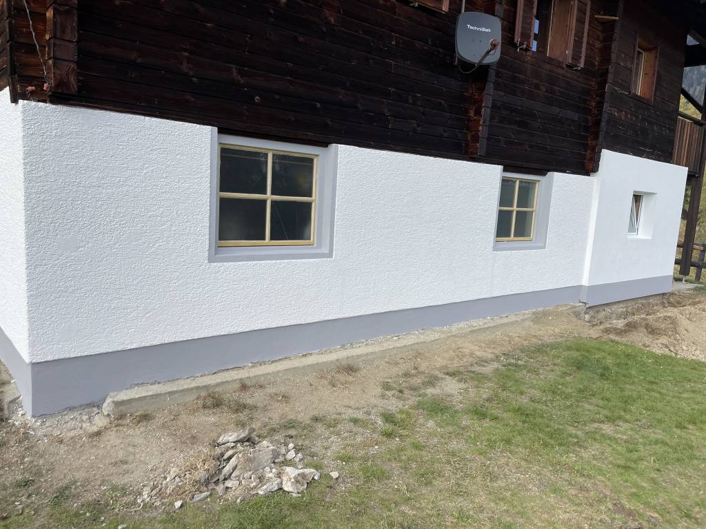 Der neue Sockel schützt das Gebäude dauerhaft vor Feuchtigkeit und fügt sich optisch ruhig in die bestehende Fassade ein.
